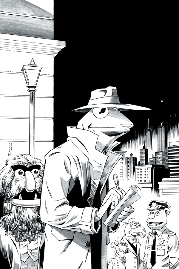Legendary cartooning talent and Muppets comics veteran ROGER LANGRIDGE bellies up to the drawing table once more for an all-new tale of crime and pun-ishment with The Muppets Noir #1 - featuring clue-filled cover art from both the author and guest artist DECLAN SHALVEY, as well as an appropriately enigmatic DELUXE MYSTERY BLIND BAG! The Blind Bag contains two limited editions of the issue selected randomly from a range of variant covers exclusive to this offering - including a new original cover, colored blanks, and more! Please Note: The number of Blind Bags is limited, and allocations may occur.