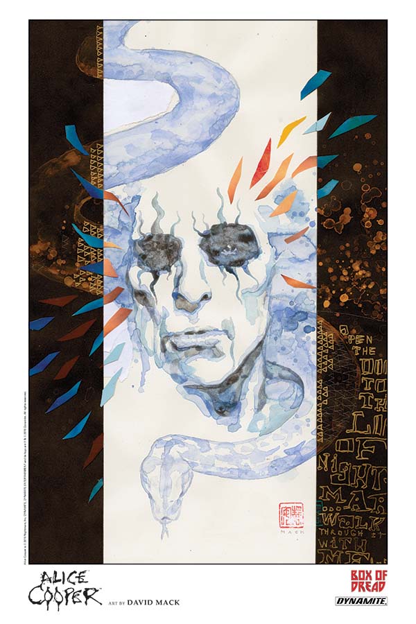 Price: $299.99 Shipping: July, 2015SKU: C123612 Rating: Teen+ Art: David Mack Genre: Fantasy, Horror Publication Date: July 2015 Format: 11" x 17" Poster UPC: 725130236128 ON SALE DATE: July 1 Autographed by Alice Cooper himself, and limited to 100 copies! Alice Cooper, rock 'n roll icon and Dynamite's Lord of Nightmares, has assumed many macabre and surreal personas over the course of his monumental career... and now, superstar artist David Mack (Kabuki, Daredevil) reimagines the Godfather of Shock Rock with his own unique painted style. Printed on 100# gloss book paper with flood gloss aqueous coat, this 11" by 17" lithograph is packaged individually in its own protective tube to guarantee safe shipping and handling. Previously available only through the Box of Dread crate, Dynamite proudly makes the Alice Cooper lithograph available for comic shop customers everywhere.