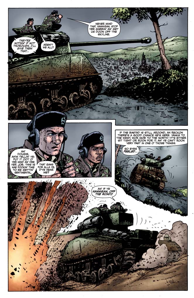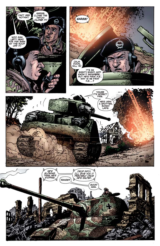 SKU: C725130144430 Rating: MATURE Covers: Garry Leach Writer: Garth Ennis Penciller/Inker: Carlos Ezquerra Colorist: TBD Genre: HISTORICAL FICTION Awards: N/A Publication Date: MAY, 2010 Format: Comic Book Rights: WW Age range: 16+ UPC: 725130144430 Sergeant Stiles' hatred of the Nazis has got him right where he wants to be: sitting behind a high-velocity cannon with a mighty German tank in his sights. But Tigers are never more dangerous than when they're cornered, and the Panzer crew will be only too happy to take their enemies with them. The cat and mouse battle is fought to the finish, as the second Battlefields arc concludes with a bang.