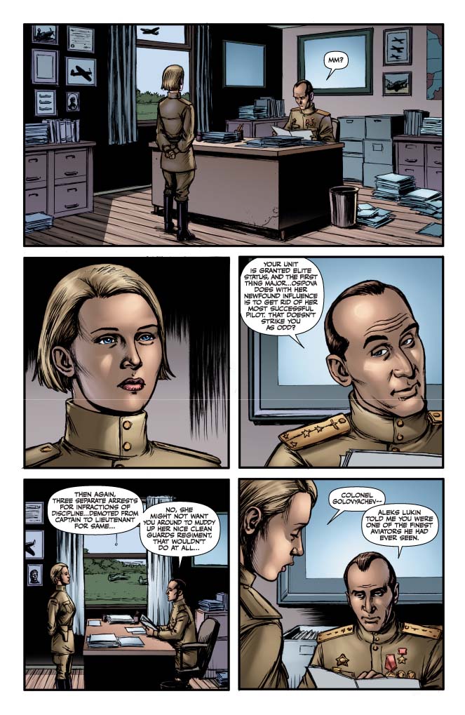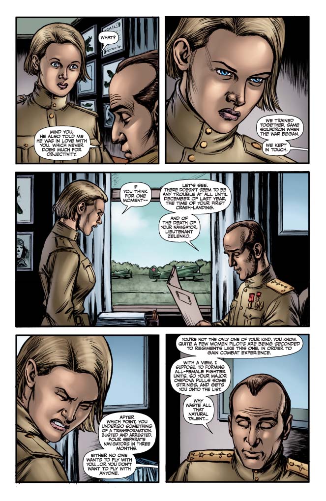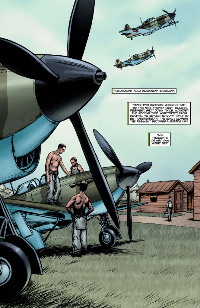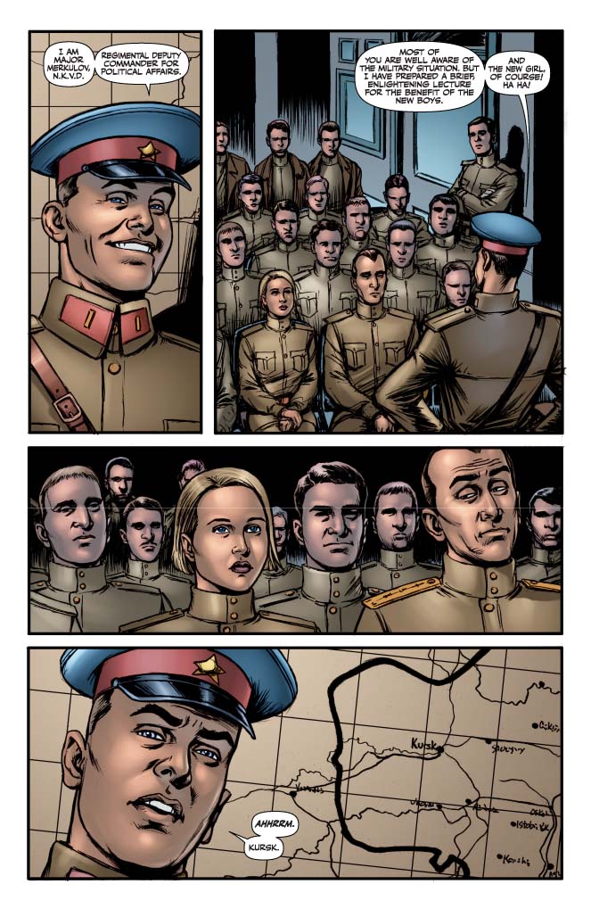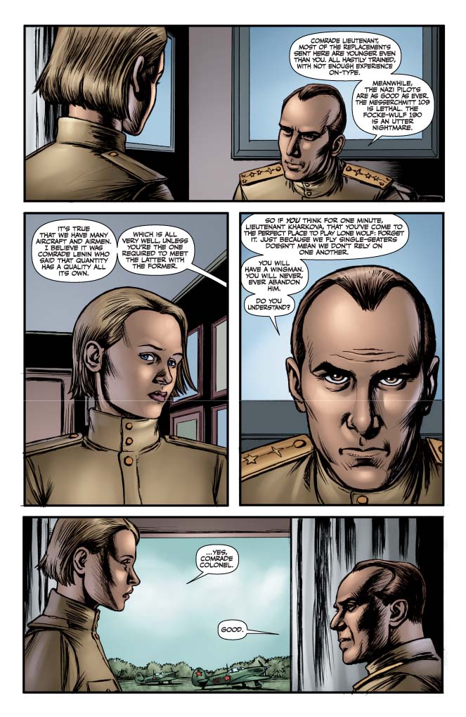 Price: $3.50 Shipping: Sold OutSKU: C725130146946 Rating: MATURE Covers: Garry Leach Writer: Garth Ennis Penciller/Inker: Russ Braun Colorist: TBD Genre: HISTORICAL FICTION Awards: N/A Publication Date: JUNE, 2010 Format: Comic Book Rights: WW Age range: 16+ UPC: 725130146946 The sequel to last year's "The Night Witches" begins with a bang, as Lieutenant Anna Kharkova is posted to single-seat fighter aircraft and sent straight into action. Hardened and embittered by the loss of her comrades, Anna is only too keen to get her teeth into the enemy- but with Russian and German armies about to collide in the titanic battle of Kursk, her first flight with her new squadron may well be her last. And once the Soviet secret police start sniffing around, death in battle may well be preferable anyway...