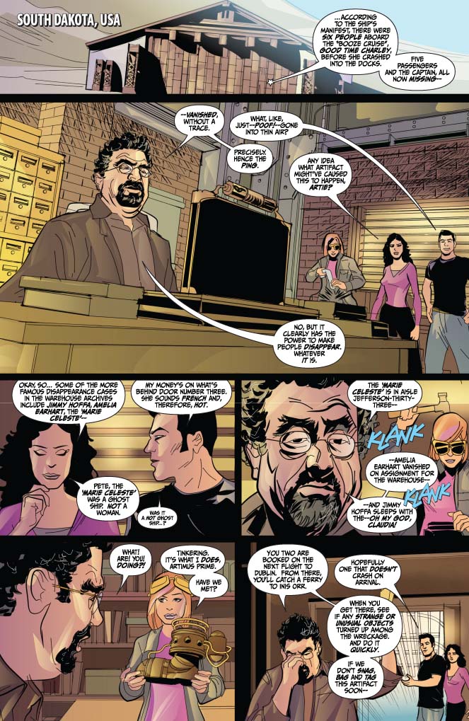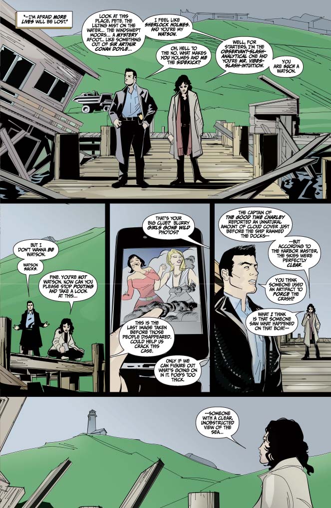 Price: $3.99 Shipping: Sold OutSKU: C725130176851 Rating: Teen + Covers: Ben Morse (50%), Photo Cover (50%) Writer: Mike Johnson & Ian Maddox Artist: Ben Morse Genre: Media Tie-In, Sci-Fi Awards: N/A Publication Date: Sept 2011 Format: Comic Book Page Count: 32 pages Rights: WW Age range: 16+ UPC: 725130176851 The comic book series based on Syfy's hit TV show continues! When people begin disappearing into the mists of a small island off the coast of Ireland, Pete and Myka travel to the Emerald Isle to solve a mystery worthy of Sherlock Holmes! What's the artifact responsible? Why were those people targeted? And the biggest question of all: when Myka is taken, can Pete snag, bag and tag the artifact is in time to save her from disappearing forever?! Written by WAREHOUSE 13's very own Mike Johnson & Ian Maddox!