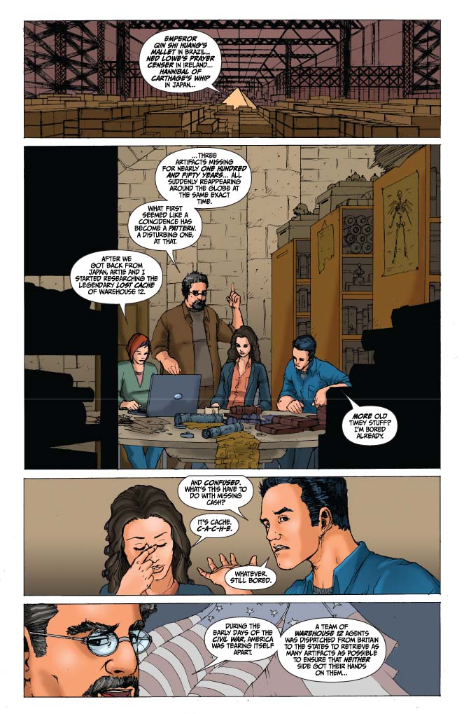 Price: $3.99 Shipping: Sold OutSKU: C725130182135 Rating: Teen + Covers: Ben Morse (50%), Photo Cover (50%) Writer: Ian Stokes Artist: Ben Morse Colorist: Ben Morse Genre: Media Tie-In, Sci-Fi Awards: N/A Publication Date: Nov 2011 Format: Comic Book Page Count: 32 pages Rights: WW Age range: 16+ UPC: 725130182135 After a hundred and fifty years at the bottom of the ocean, a collection of dangerous artifacts has finally surfaced and it's up to the Warehouse team to retrieve it. But when the trail of the legendary Lost Cache leads to a remote corner of the Pacific Northwest, Pete and Myka are the ones who suddenly find themselves in danger of being snagged, bagged and tagged! For as they're about to discover, a deadly new adversary has them in her sights -- and the Artifact Games have begun!