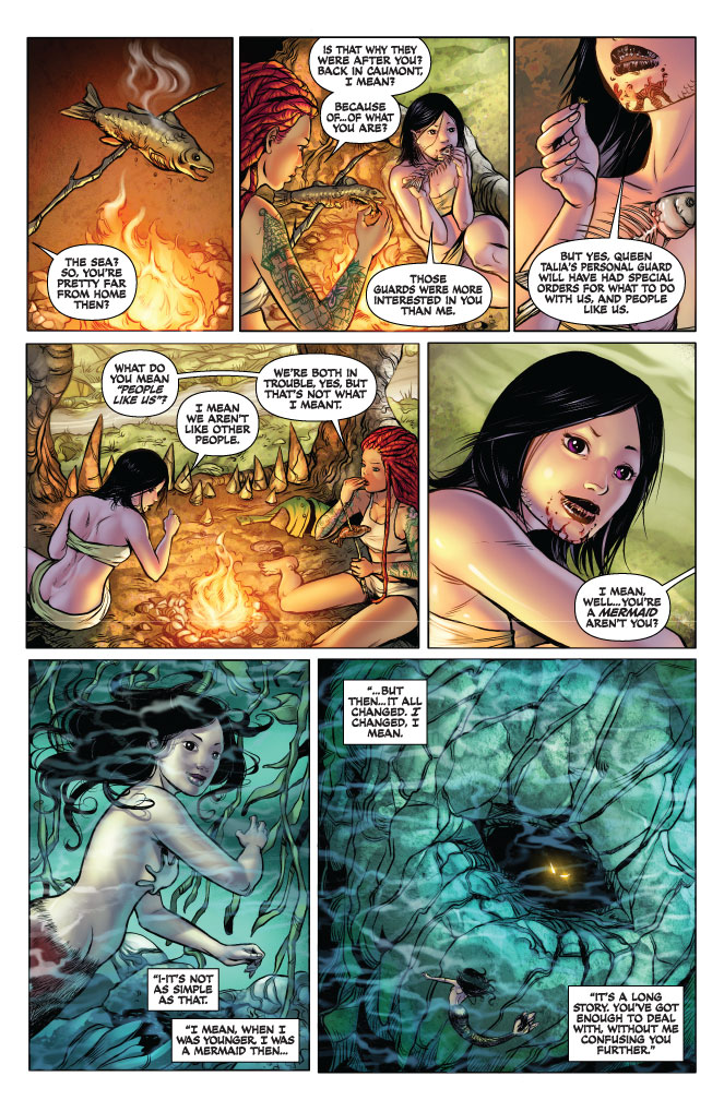 Price: $3.99 Shipping: Sold OutSKU: C72513019688000211 Covers: Joseph Michael Linsner Writer: Leah Moore & John Reppion Artist: Aneke Genre: Fantasy Awards: N/A Publication Date: Oct 2012 Format: Comic Book Page Count: 32 pages Rights: WW UPC: 725130196880 00211 UPC: 725130196880 00221 UPC: 725130196880 00231 From the tales of Cinderalla, Sleeping Beauty, The Little Mermaid and Snow White comes Damsels! In Caumont - Castle King Persine and Queen Rapunzel are still reeling from the discovery of a mysterious spy in their midst. The loyal subjects of Caumont must be made aware of the sinister magical threat before it's too late! Meanwhile, having made her escape from Caumont via the River Esk, Rapa is still struggling to make sense of her situation. Can she really trust the amphibian girl who saved her life, or is she even more confused than Rapa herself?