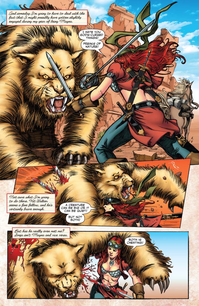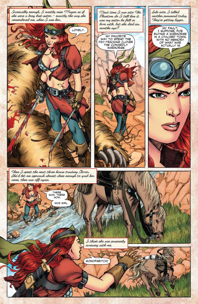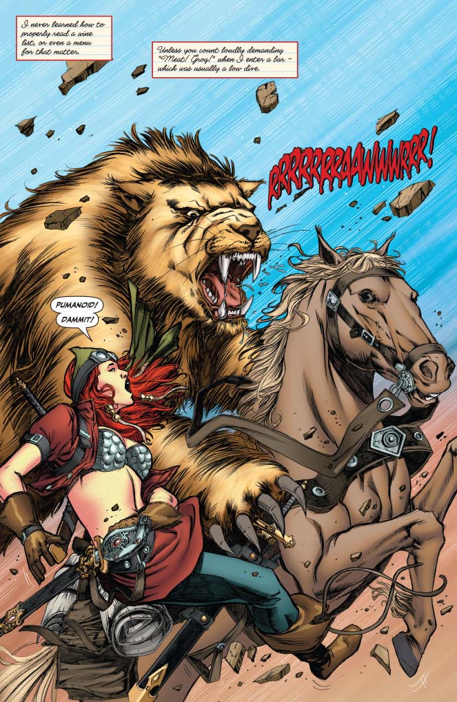 SKU: C72513021268906011 Rating: Teen + Covers: Joe Benitez Writer: Bill Willingham Art: Sergio Fernandez Davila Genre: Steampunk, Action/Adventure Publication Date: Jul 2014 Format: Comic Book Page Count: 32 pages UPC: 725130212689 06011 ON SALE DATE: July 23 THIS IS IT! The moment you have been waiting for since landing in the Big City with Magna Spadarossa: the appearance of RED SONJA! Monsters, villains, and bloodshed fill this issue as The Steampunk She-Devil fights her way through the beast laden lands of Monstocity to unravel the true mystery of this saga: what are these beast men, what is their connection to the multitude of identical assassins, and where do they all come from?