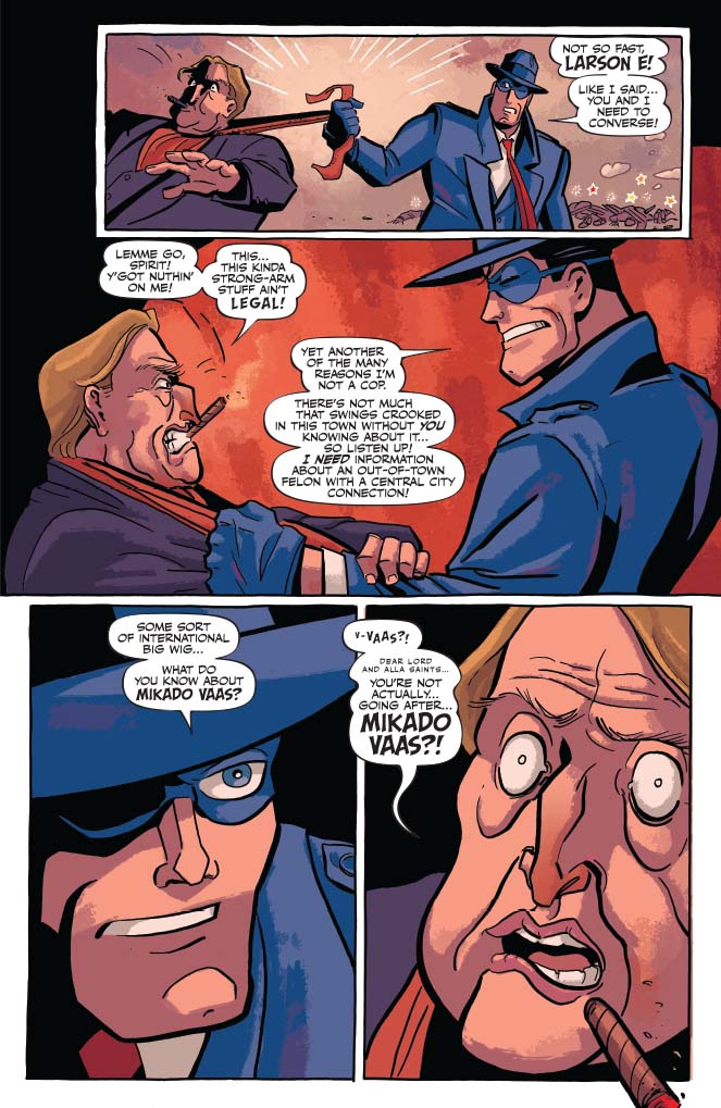The Spirit's return to Central City stirs up both resentment and fear among the local crime scene, and mob boss Larson E. Jones soon sets a price on the blue-masked hero's life. Meanwhile, The Spirit himself tries to set things right in regards to his long-stalled romance with Ellen Dolan, and the detective team of Ebony White and Sammy Strunk dig up evidence that leads to a shadow corporation - one acting as a front for the illicit activities of the mysterious international crime lord, Mikado Vaas! Eisner Award-winning author Matt Wagner continues his loving homage to one of comicdom's most iconic characters, all the while breaking new ground with the dynamic visual stylings of artist Dan Schkade and colorist Brennan Wagner.