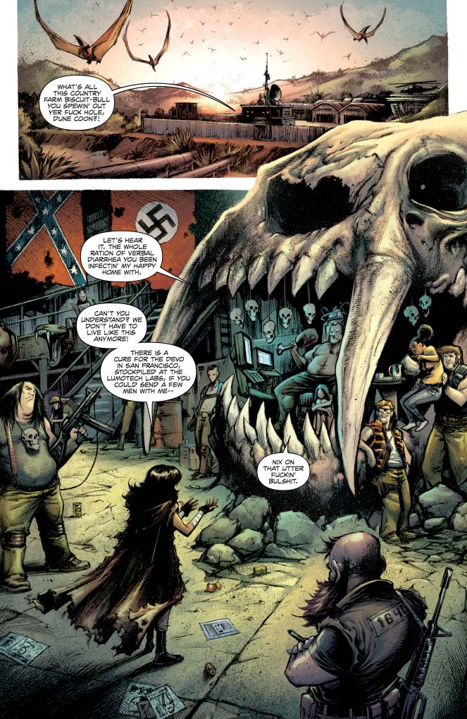 Price: $3.99 Shipping: In-Stock!SKU: C72513024365202011 Rating: Mature Cover A: Jae Lee Writer: Rick Remender Art: Jonathan Wayshak, Jordan Boyd (Colorist) Genre: Science Fiction Publication Date: February 2016 Format: Comic Book Page Count: 32 pages UPC: 725130243652 02011 ON SALE DATE: February 17 The road to salvation is lined with Nazi hillbillies and Neanderthals. Raja finds that trusting people is a bad idea. Check out the thrilling new series that Rick Remender (Black Science, Deadly Class) describes as "a heavy dose of high-octane action, character drama, a world of strange reverse mutations, and social commentary - as we follow the last tribe of humans inoculated from the devolution agent as they set out on a desperate journey to try to find a way to re-evolve life on Earth.
