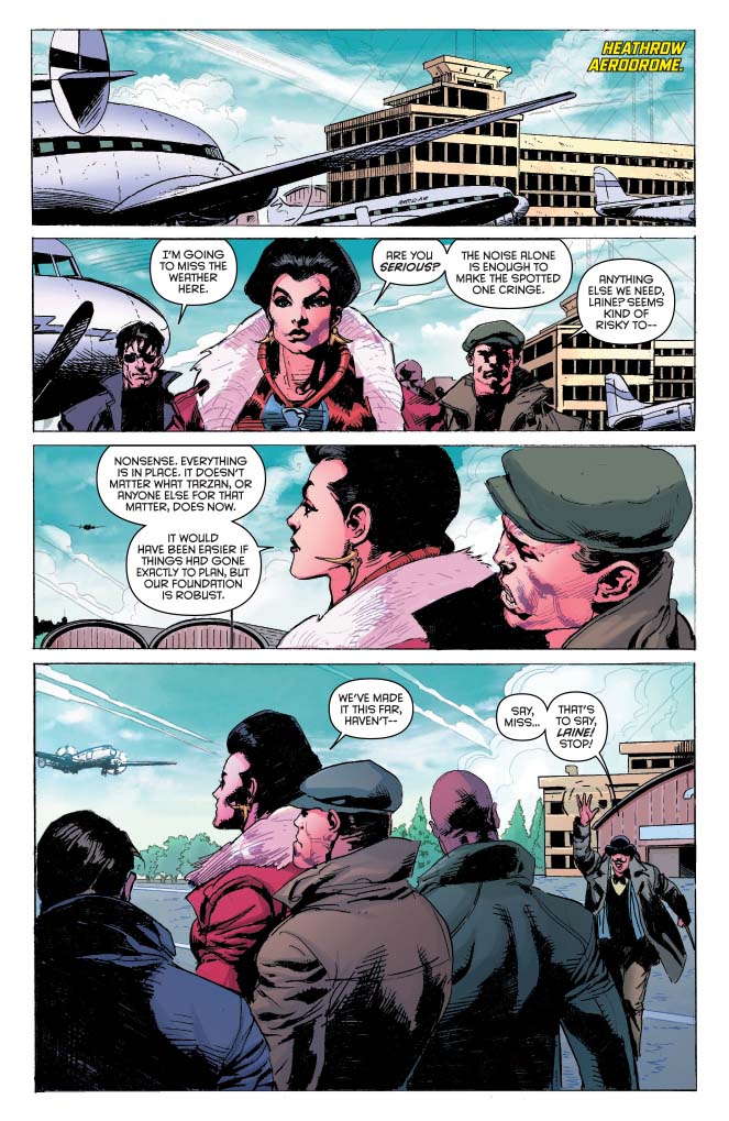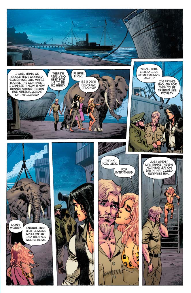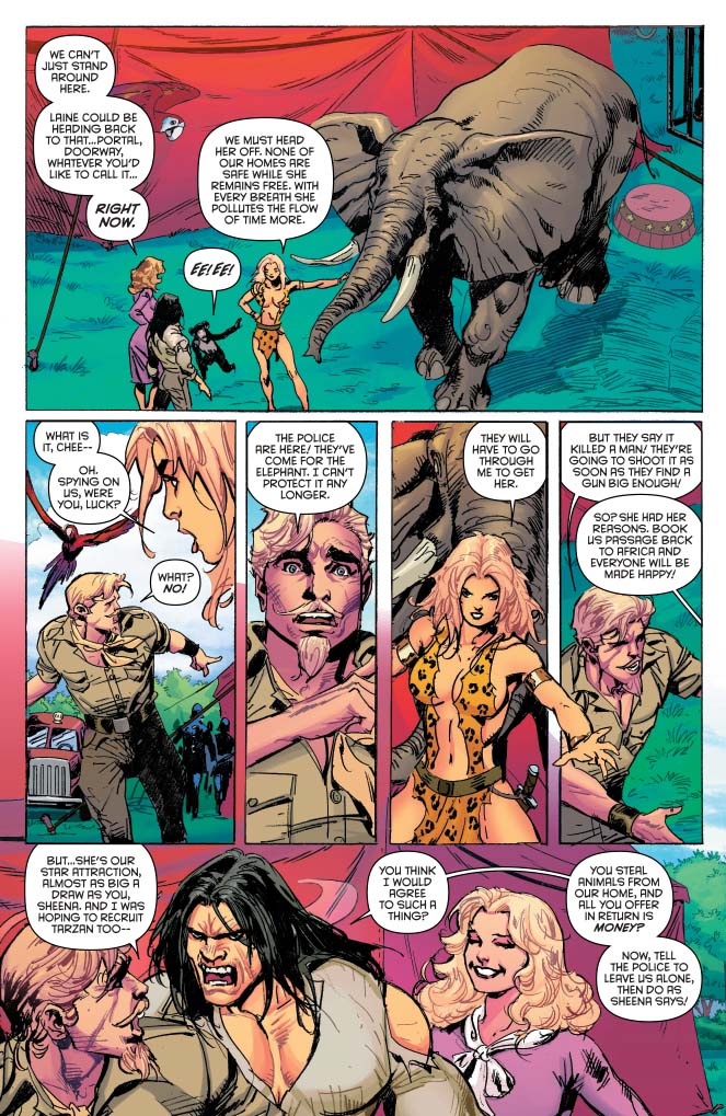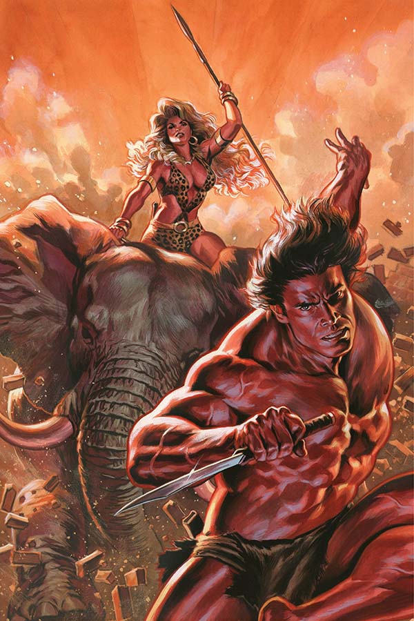 SKU: C72513024591505011 Rating: Teen + Cover A: Felipe Massafera UPC: 725130245915 05011 Cover B: Roberto Castro UPC: 725130245915 05021 Writer: Corinna Bechko Art: Roberto Castro Genre: Fantasy, Action/Adventure Publication Date: July 2016 Format: Comic Book Page Count: 32 pages ON SALE DATE: 7/20 With the scope of the plot behind Jane's kidnapping laid bare, Tarzan and Sheena are faced with something even more sinister: the possibility that no timeline is safe from the depredations of an apocalyptic cult! But with few resources and even fewer friends, can they wrest their fates and the future of their homes from the hands of Laine and her power mad cronies?