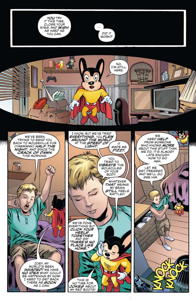 SKU: C72513025967703011 Rating: Teen + Cover A: Igor Lima UPC: 725130259677 03011 Cover B: J. Bone UPC: 725130259677 03021 Writer: Sholly Fisch Art: Igor Lima Genre: Superhero Publication Date: August 2017 Format: Comic Book Page Count: 32 Pages ON SALE DATE: 8/9 Aliens are invading Mighty Mouse's hometown of Mouseville - but he can't save the day while he's trapped here in the real world! To make things worse, Mighty Mouse and Joey don't suspect that there's a planet-level menace waiting to threaten our Earth too...and it's not just the bullies who are after Joey!